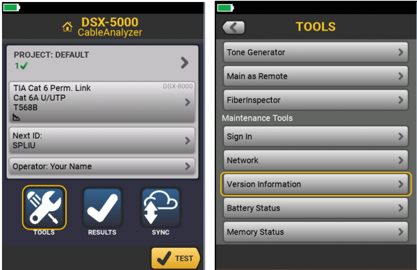 It is normal for the Software and Hardware versions on the MODULE @ MAIN screen NOT to match the Software and Hardware versions on the MAIN TESTER screen, even after a software update. As long as you are updating the Versiv Main and Versiv Remote when a new update is available, any measurement modules will be updated automatically when they are connected to the test set. The example above does not indicate that the DSX-5000 module needs an update.