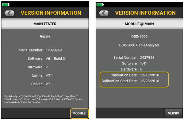 In the MODULE screens below, the Versiv Main was running version 6.1 Build 3. Calibration on these modules is considered due one year beyond the stated Calibration Date.