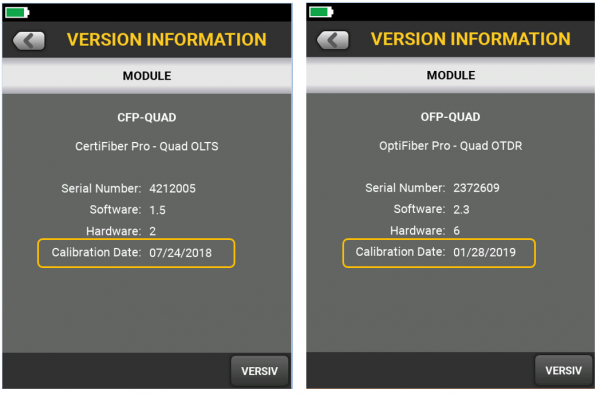 You can connect any of the modules to the Versiv mainframe and check Version Information to interrogate the module. The module is considered due for factory calibration one year beyond the stated Calibration Date or Calibration Start Date.